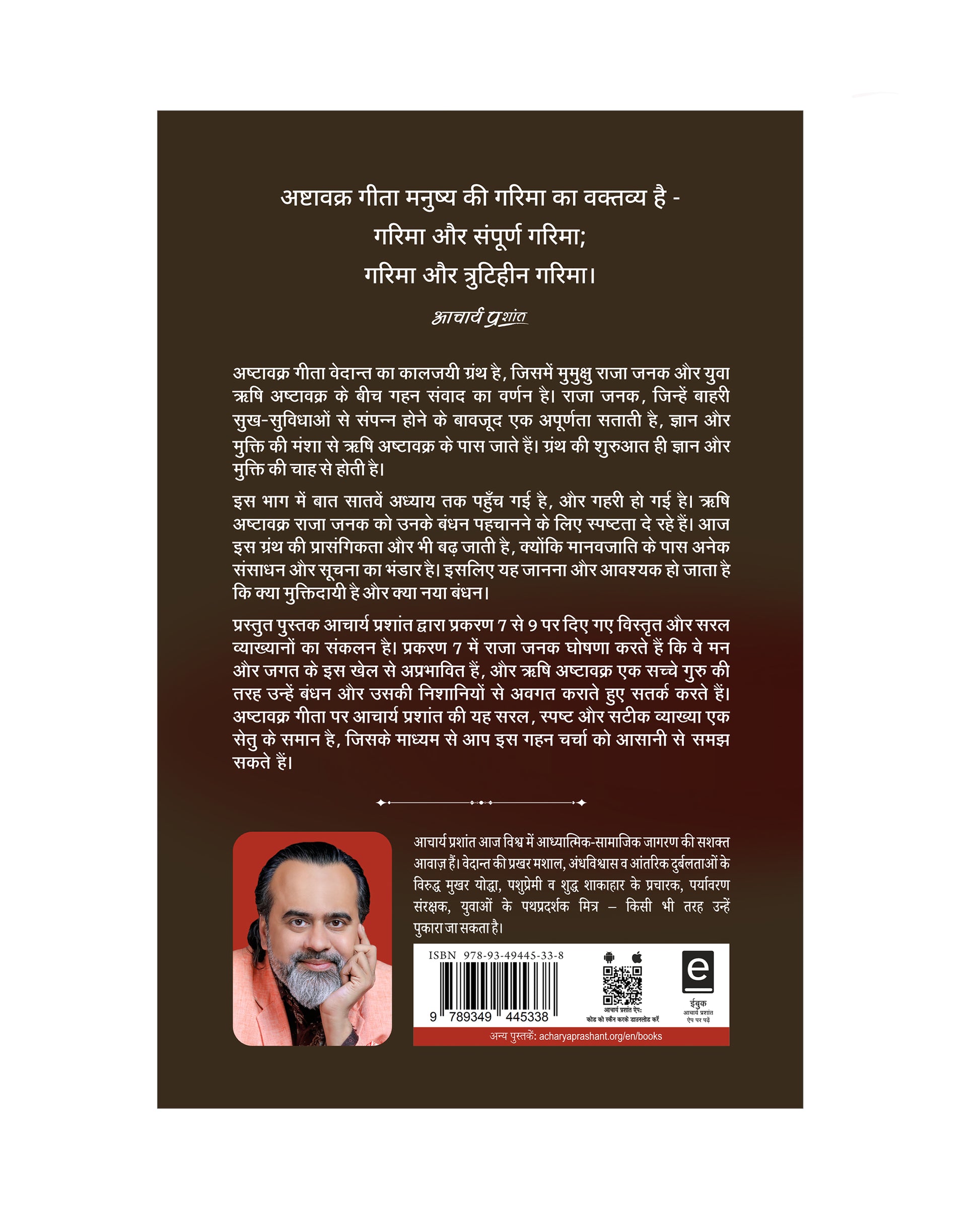 प्रस्तुत पुस्तक आचार्य प्रशांत द्वारा प्रकरण 7 से 9 पर दिए गए विस्तृत और सरल व्याख्यानों का संकलन है। प्रकरण 7 में राजा जनक घोषणा करते हैं कि वे मन और जगत के इस खेल से पूरी तरह अप्रभावित हैं, और ऋषि अष्टावक्र एक सच्चे गुरु की तरह उन्हें बंधन और उसकी निशानियों से अवगत कराते हुए सतर्क करते हैं।